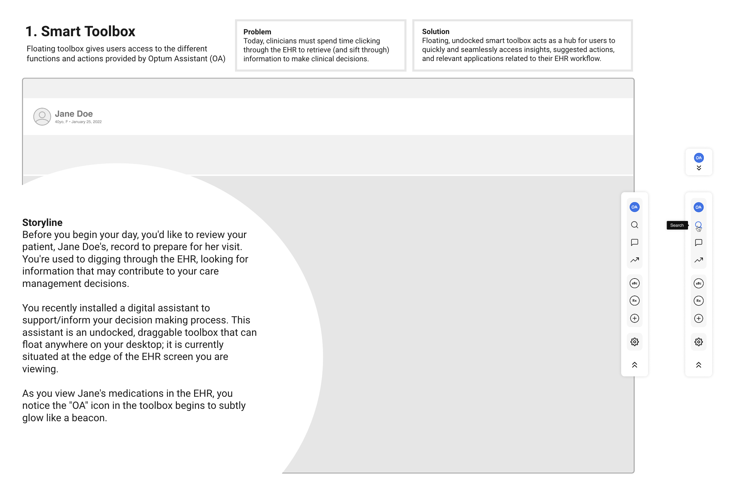 To address concerns about adoption, scalability, and focus risks identified earlier, I led UX strategy, research, prototyping, and validation to define a minimum viable assistant that met both clinical and organizational needs. This comprehensive approach ensured that the solution was scalable and trusted for future integration, reinforcing stakeholder confidence in the project's success.